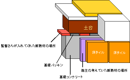 | 木津田 秀雄 | こんにちは、解説委員の木津田です。 相談の写真等拝見しました。写真の土間部分は、玄関の内側のようにも見えますが、そうだとして写真の手前側に玄関ドアが別途取り付くことを前提に回答します。 まずそこそこのハウスメーカーであれば、このようなケースの正しい施工方法をマニュアル化していると思いますので、その方法を示してもらってください。その通りに施工するのが一番よい状態になると思います。 「高断熱の家」とのことですが、他の基礎や床などの断熱材はどこに入っているのでしょうか?断熱材が入る場所としては、1.床の直下部分(根太の間)、2.基礎の立ち上がりの内側(床下の外壁下)、3.基礎の立ち上がりの外側があります。 1.の場合は床下空間は外気と同じ条件になります。2.3.の場合は床下空間は室内と同じになります。 したがって玄関の室内の土間部分と床下の間が議論になっているのだとすれば、1.のケースでは問題有り、2.3.のケースでは床下も室内と同じなので問題なしということになります。 土台に基礎パッキンを使用していることからも基礎断熱ではなく、1.の床の直下部分で断熱を行なっているのだと推測されますが、その場合ご指摘の通り床下には外気と同条件の空気が入り込むため、土台に基礎パッキンを使用していればそのまま床下の空気が室内に入り込むことになります。 このような状態の場合、通常はフィルムや木材で床下側に気流止めを施工しますが、断熱材を基礎パッキンの間に入れるような工事は行ないません。この部分での問題は、断熱より漏気にあると思いますので、空気が出入りしないように対処する方が適していると思います。 床下換気口ですが、ネコ土台が周囲にも設置されていれば、それだけで基準法の規定を満たしている可能性もあります。ネコ土台がブームなのですが、実際には結構な数を入れる必要があるので正確に計算すると必要開口を確保するのが難しかったりします。ちなみに私の廻りではネコ土台は、土台と基礎コンクリートを密着させないためだけに使用しており、床下換気口は別途取り付けています。 断熱材をコンクリートの立ち上がりに施工する場合は、タイルの接着性の問題もありますので、内側に施工した方が良いと思います。ただし基礎部分に断熱を行なうかどうかは設計者と相談して下さい |