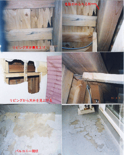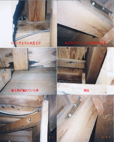 | 三浦 惠翁 | 梁材の捻れについては長期間の雨漏りにより梁の片面だけが乾燥できず、捻れを起こしたものと見受けられます、乾燥させればあまり問題は起きないと思います。 FRP防水は確かな業者が正しく施工したのでしょうか、4年ぐらいでトップコート材の剥れが起きているのが気になります。 又 写真では漏水がべランダ隅立ち上げ部分と推測できますが、サッシ水切が取り付けられていない事からサッシと防水層の合わせ部分からの漏水も考えられます。 シート防水施工前に5cmぐらい水を張り再度漏水カ所の特定をして見て下さい。 この検査で水漏れを起こすようなら、現防水層を撤去下地より改修される事をお勧めします。 サッシ水切りに就いては取り付けてもらい外壁が何か判りませんがサッシ廻りコーキングにも注意必要です。 天井断熱材不施工、配線はステップル止めしない、天井吊木梁に直止めなど単価のわりに雑な仕事です。 建売図面と見受けますが注文住宅なのでしょうか。改修時も監理はしかりしてもらいしょう。 |
