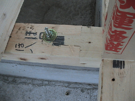 | 清水 煬二 | 解説員の清水です。 筋交いプレートのビスは、ビスの強度上、通常7本必要となっているはずです。 あとの2本は、ホールダウン金物の影に隠れていませんか? そうなっていれば、この点は問題ありません。 こういう場所に適したいい金物が他にもありますが、金物とホールダウン金物との位置関係もこれでも問題ないと思います。 金融公庫の本店でも、このような状態で実物の構造体サンプルを展示しています。 (現在も展示しているかどうかは、わかりません) ただ、木片のパッキンを金物と土台の間にかましているように見えますが、その点は私は問題だと思います。 このパッキンは縮んできてつぶれます。防蟻上の問題もあります。 パッキンを取ってもらって、筋交いをやり直してもらううように要求してみてはいかがでしょうか? 今なら、業者側にとっても、それほど費用も掛からないはずです。 職人の工事がミスとは言えなくても、施主に不安感を与えてしまっているわけですし、決して褒められた仕事とは言えません。 対応してくれるかどうかも、業者の信頼性のバロメーターのひとつになるかもしれません。 土台に関しては、継ぎ手にアンカーボルトがきてしまう、よくある間違ったパターンです。 土台の継ぎ手とアンカーボルトの位置を確認せずに職人任せにして設置すると1〜2箇所はこうなります。 役所の中間検査でも、普通は見ることもなく無視しますが、事前に指摘すれば必ず問題にして、手直しの指示を業者にしてもらえたはずです。 実質的にケミカルアンカーなどで手直しすべき問題かどうかは、その土台上の廻りの筋交いとの関係とアンカーボルトの数や間隔から、引き抜き力を比べて結論を出すように私の場合はしています。 この写真では、その関係がわかりませんので、なんとも言えません。 |