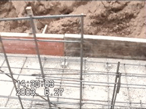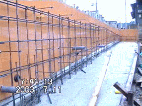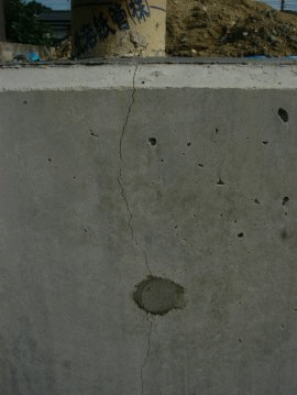 | 大内 彰 | 解説員の大内です。 現状の写真で擁壁の天端の傾きがなさそうに見えるので擁壁の不同沈下はないように思いますが如何でしょうか。 ダブル配筋とシングル配筋の切替のところにクラックが入っているのは乾燥収縮の可能性が高いです。横方向の鉄筋の断面積が半分になり、その上スリーブでコンクリートの断面積も減っているのでその個所で横方向の力に対して不連続になっているのでそこに力が集中したのでしょう。特に大きな問題のようには思いません。ただ、クラックが入って問題が無いかというとそうではありません。そのクラックの部分から進入した水と空気によって鉄筋が錆びてしまうのでそうならないように対処すべきでしょう。また、このクラックがまだ拡がる可能性がある(まだコンクリートが落ち着いていない)ので注意が必要です。 |