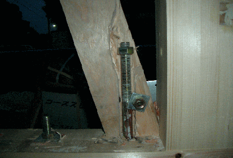 | 相談内容 | [相談内容] 上棟から4日目となります。 不安に感じた点が何点かありましたのでご相談させてください。 1.アンカーボルトと筋交いが干渉しているのか、筋交いをかなり削ってしまっています。 2.また柱との距離も離れすぎているように感じます。 3.筋交いプレートが柱を削って曲がって着けられていました。 4.基礎パッキンが指で軽く押すと土台から取れてしまう個所がいくつもあります。 5.1箇所は鉄のプレートが基礎パッキンの上に2枚重ねられていました。 順調にきていると思っていたのですが、ここにきて不安が一杯で胃が痛くなってきました。 よろしくお願いいたします。 筋交いがホールダウン金物と干渉し、欠損している。 ![]() 同上 ![]() 金物の取付け部分 ![]() |