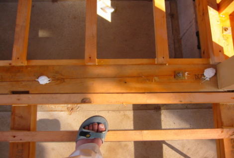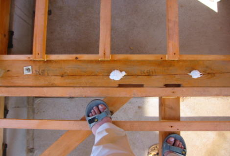 | 大内 彰 | 解説員の大内です。 土台に開いた余計な孔について、耐力的な意味では孔が径の7倍離れていれば問題ない(応力の方向によっては4倍でも良い)と考えていいでしょう。4枚のうちの1枚についてはかなり近いところに孔が開いているので耐力的には十分な耐力を発揮できないという意味では問題ありです(その箇所には殆ど力がかからないということが分かっていれば問題ないのですが)。 対策としては、まずボルトの ナットを外し、厚さ6mm、幅80mm、長さ150mmくらいのプレート(ボルトを通す孔を中心に開ける)をビス(ホールダウン用のビスが便利)を8本程度をボルト挟んで4本ずつ打ち込み、ボルトのナットを締めなおせば十分ではないかと思います。ただ、この補強は建物を全く知らない状況でのアイディアなので設計者に確認してもらう必要はあります。 |