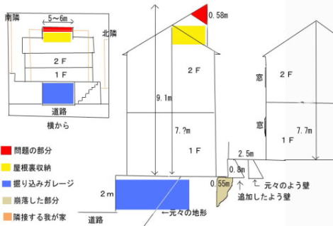 | 相談内容 | [現象] 初めまして、自宅を建てる際にも色々参考にさせていただいていました。 隣地の空き地(東側)が売られて二階建ての家が建つ事になり、相談させていただきます。 経緯が大変ややこしいため、長文になってしまいますが、しばしお付き合いください。 自宅隣は元々V字型の谷(自宅から最深部の高低差は8mほどです)の上にあり、そのV字の谷の最深部によう壁を立てて埋め立て造成する開発がありました。 空き地の公道に接していたのが我が家がある方角だけでしたので、ほぼこちら側の高さに合わせて盛り土し、約2000uに13区画の一戸建てとする計画でした。 谷の反対側下部には一戸建てがあり、敷地に接して3〜8mのよう壁が立ち上がる事となり反対も非常に強く、業者自体もかなりいいかげんな業者で、色々ありましたが開発は一応終了しました。 我が家の隣近所も谷が埋まって東側に家が建つため、日照の影響を心配していましたが、こちらのHPで日照は自分の土地で確保すべしというアドバイスに従い、区画割りの段階で南側隣家と1区画分の広さを購入し、それぞれの敷地と同じ長さX4mの距離をとれる様に開発業者に依頼し、2mの距離で話がつきました。 しかし売買契約の段階で、業者側から「なんとか1mで頼めないか」と相談があり、同様に開発地に接する南側の隣家と共に「転売せずに最後まで責任を持って建築する事と、屋根の傾斜を我が家の方向にもきちんとつける事」を条件に1mで購入しました。 それから11区画の建築が終わりましたが、我が家と南側隣家に一部接する新区画の間口が長く、面積も広かったせいか売れ残って2年が経過し、何とか契約する事ができた様でしたが、その契約者が開発と建築契約を結んだ業者のいいかげんな姿勢を嫌がり、建築条件付きを解除して別の業者に依頼した様です。 開発業者からは、転売の連絡は一切ありませんでした。 地鎮祭を行っている時に、契約者の方を見かけたのでお話を伺ってみましたが、予定では屋根の高さも我が家より0.8mほど低くなる予定だというので、南隣の方と一緒に「1mでも買っておいて良かったね」と安心していました。 ここから話がややこしくなるんですが、隣地に接する道路の高さから2mの掘り込みガレージの上に家が建つ予定でしたが、掘り込み作業をしている段階で大雨が降り、養生処置もしていなかったため、我が家のよう壁の下が幅9m、高さが1.8m、奥行きの一番深い所で30cmほど崩れてしまい修復作業が必要になりました。 新しい業者の方と修復の話し合いをしている時に、建築予定の二階建ての家に屋根裏収納をつけるため、屋根の通常の最高地点から我が家に面した側に屋根が伸びて高さが9mを越える事が判りました。 屋根裏収納とガレージの話は以前の業者からも聞いていましたが、高さは知りませんでした。 そこで屋根裏収納の体積を減らさず、屋根の高さが減る様に、「長い屋根のデザインにこだわりがなければ、収納の上部の屋根中央部から傾斜をつけてはもらえないか?」と依頼したところ、施主の方は「元々のプラン図でそうなっていただけで、別にデザインにこだわりはないのでいいですよ」と了解を得ました。 しかし、業者の方からは「建築確認が既に下りているのと、再度の変更と雨どいを新設するが必要があり、変更に必要な費用はそちら(我が家)持ちでお願いしたい」と言われたと施主の方に伝えられました。 見積もりを出してくれる様に依頼しましたが、どうやら建築プラン自体は、以前の業者の初期デザインのままだそうで、我が家と南側隣家が以前の業者と土地売買契約をした際に約束した屋根のデザイン変更プランではなく、その条件も伝わっていない様です。 施主の方がいらした際に私は不在で、妻が話をうかがったそうですが突然の来訪でもあり、その際に以前の業者と交わした約束の話を伝える心の余裕はなかった様です。 そして見積もりが今日来ましたが、総額で18万円。 内訳は再設計再申請費用が8.3万円、カット済み材のやり直し工賃と材料費が8.5万円、雨どいの増加と外壁減少の差額が1.8万円、現場管理費と諸経費が2.34万円出精値引が3万円だそうですが、肝心の高さの減少は0.58mだそうです。 図面を提供していただいた訳でもなく、話の過程で覚えている範囲の数値なので判りにくいかもしれませんが、概略図を作成してみましたので参考にしてください。 [業者の見解] 「建築確認が既に下りているのと、再度の変更と雨どいを新設するが必要があり、変更に必要な費用(18万円)はそちら(我が家)持ちでお願いしたい」 [相談内容] この18万円という金額は妥当なものなのでしょうか? 我が家と南側隣家が、以前の業者と土地売買の際にした約束を、転売する際に伝える義務や、購入する側が付帯条件の有無などを確認する必要はないのでしょうか? わずか0.58mの高さの違いは、日照に18万円に相当する効果があるでしょうか? 我が家を建てる際も建築確認後に、階段が13段である事